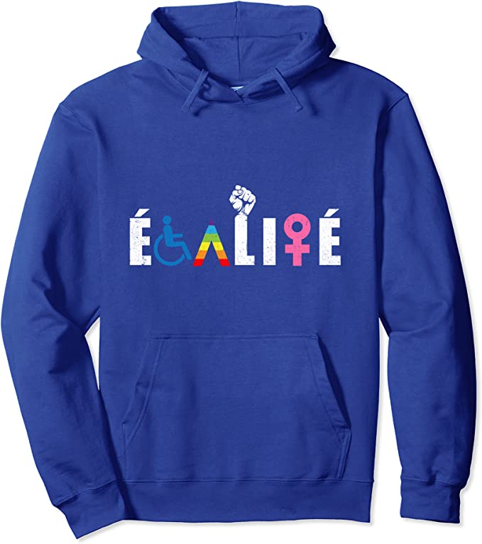 Avec écrit Egalité avec plusieurs symbole (fauteuil roulant, main en l’air, logo lesbien)…